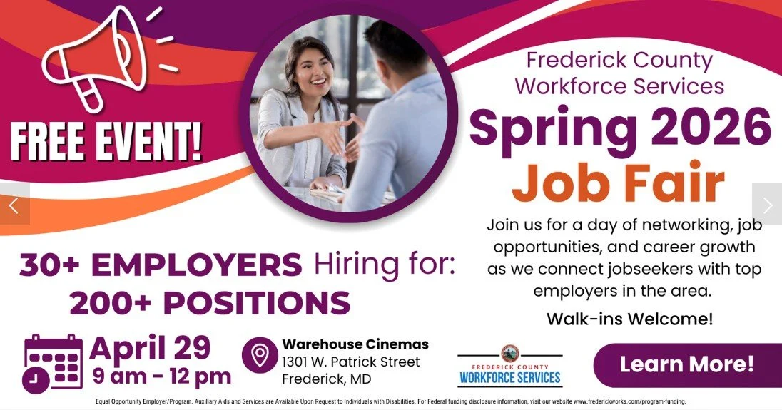 Wednesday, April 29, 2026 - Spring Job Fair - The Frederick County Workforce Services Spring 2026 Job Fair is coming to Warehouse Cinemas! Employers are actively seeking motivated, job-ready local talent to fill a variety of open positions. In partnership with Warehouse Cinemas, this event is designed to help you move confidently toward your next career milestone.